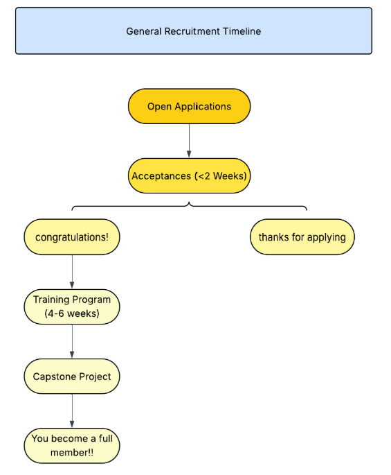 - Skill Evaluation: Members are given a capstone project after training (week 6) and present it during a general meeting.